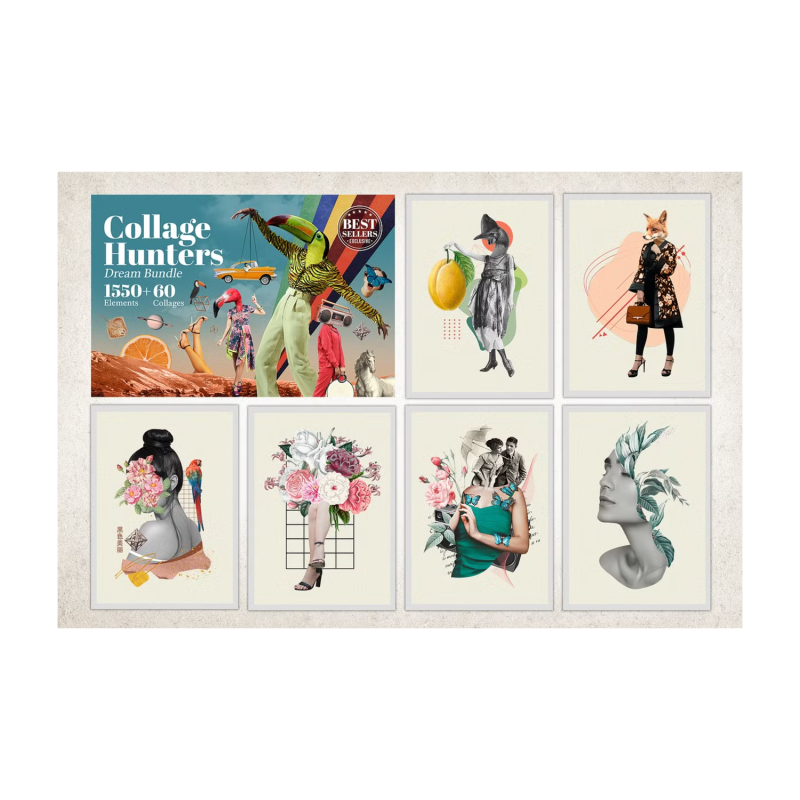 Collage Hunters Dream Bundle is perfect for anyone who wants to unleash their creativity and explore the possibilities of collage art. Whether you're a beginner or a pro, you'll find something to inspire you in this bundle. You'll get access to high-quality images, textures, backgrounds, fonts, brushes, overlays, and more. All the assets are compatible with popular design software such as Photoshop, Illustrator, Canva, etc.