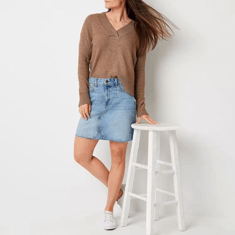 women's high-rise denim mini skirt with a bit of stretch so you can move throughout your day in comfort and features a classic button-zip fly, belt loops, 5-pocket tailoring, and distressed details for an on-trend appeal.
