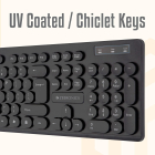 Standard keyboard layout with 104 Keys and UV-coated keycaps (full size).